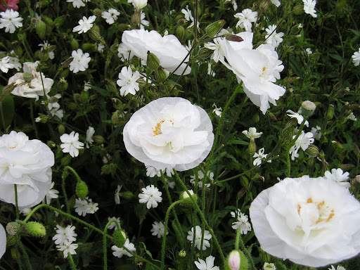 These double white Icelandic poppies weren’t carefully sown in trays and planted out – just a packet of seed thrown onto the ground where I noticed some of our native White Campion (Silene alba) growing in a border. Both flowered for months and when fading pulled up and put onto the compost heap: there will be enough fallen seed of both to germinate again next year.