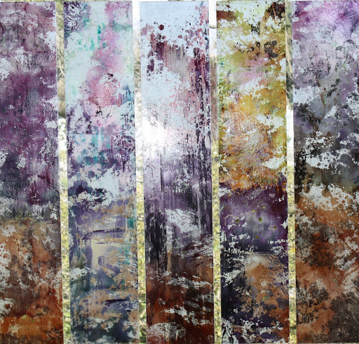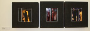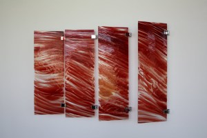 This first piece of five panels is the work of Mary Mackey, based in County Cork. I love the colours and mix – to me it is a blend found in mountains in the fall (odd how, for an Englishman, ‘mountains in the autumn’, doesn’t sound as expressive or as romantic!). However, much of Mary’s work is inspired by the sea and this particular piece is titled ‘Sea-shushed Secret Places’. Painted and sandblasted, the strong colours used still have a swirling, dream like quality about them. Perhaps it is the light coming through the piece that allows this contradiction. Mary, in her own description of her work, tells of how she sees a flash of landscape: “…. fleeting images in real time, but in my memory the image is sharply focused, connected witha particular place, a particular time…..stored and enriched by treasuring it…..until at least something of that essence is achieved“.