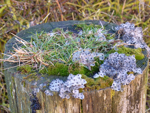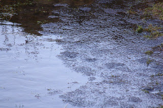 This year the frogs have returned silently.  There is no sign of them in the water or of their frogspawn floating like oil slicks on the surface.  In the confusion of the weather, where every surface is as wet as any other, the frogs have spawned on top of the fence posts that protects the pond.  The larger posts wear a crown of spawn, the smaller ones cannot hold it and it slides off, dripping to the ground.  It is a strange and  unsettling sight: something that we have never seen before.