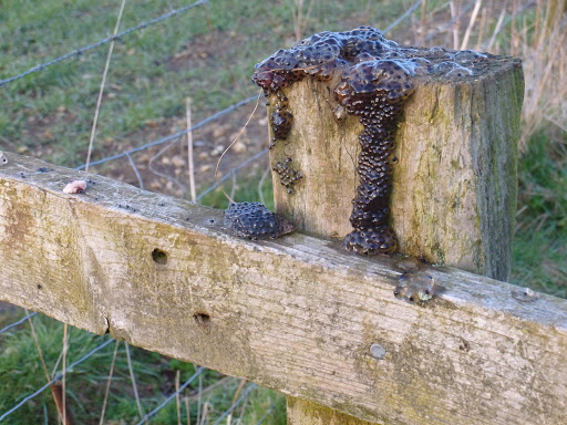 3. The spawn on the fenceposts is the result of predation by and owl or buzzard, which has taken the frog to the post to deal with it before eating it