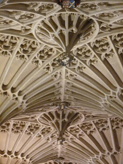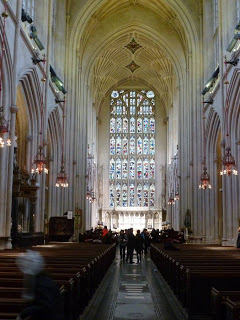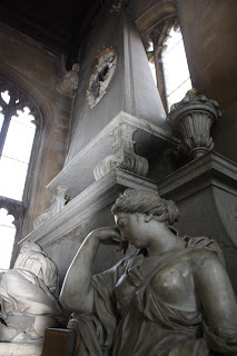 I had only been standing in the church a few moments when the organ began to play; the timing could not have been better for it set the mood for the whole visit. Lovely as it was, I moved on quite quickly to the chancel dominated by the tomb and effigies of Thomas Beauchamp and Katherine Mortimer. Both died within a few months of one another in 1369 and their effigies are unusual for they lie there holding hands, signifying not just their undying love but also their equal status for Katherine had brought land and wealth to the marriage. The chancel is also unique for its light and graceful ‘skeleton rib’ vaulted roof simply adorned with the Beauchamp coat of arms clasped by angels.