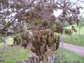 When you get to know a place intimately – whether it’s a garden or a landscape – you notice things that the casual observer misses. In the late spring of 2011, we had a biting frost that killed off not all but some of the new young growth of numerous trees – just where it touched. Some trees remained unscathed, others were totally destroyed and some just part. This is what happened to one of a pair of Horse Chestnuts visible from our little stone cottage. One tree has always been much more stunted than the other, although as their girths are the same, I assume they were planted at the same time. They stand side by side but one, when the river bursts its banks is under water for a few days longer than the other. Is it this that has caused it to be so much shorter or is it this rare burning of the leaves by frost? It took months for the tree to recover, finally sending out new spring green leaves and flower buds at the end of July contrasting greatly with the remainder of the tree whose leaves had not been harmed. Likewise, the older leaves turned their autumn colours and fell earlier than the newer ones. This year the tree, which now looks quite poorly, has reversed with the damaged leaves turning golden – in the ten days since the photograph was taken, they have fallen while the remaining leaves are yet to get their autumn tints.