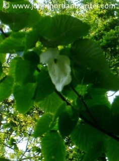 Davidia originates from China and although first discovered in the mid 1800’s it was not until 1904 that the first one was to be grown in England. If given the right conditions they grow quickly and although they aren’t fussy about soil type they do like a certain degree of shelter – mine is planted on the edge of woodland which gives protection from strong westerly gales. They do not respond well to pruning so it is important to allow it space to grow up to 60 feet in height and 20 feet across. They are attractive in a quiet sort of way even when young for, although they lose their leaves in winter, they are of a pleasing shape and shade of green during the summer months.