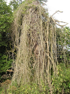 As a young child, I once stayed at a schoolfriend’s grandparents and in their garden was an old chalk quarry, long disused. I would love to revisit it now but have no idea where it was – for years I believed that the village was called Loose Chippings. It was only once I grew up that I realised that this was the sign that council workers had put up after repairing the road outside their house! There must, I assume, have been trees in the pit – and it was certainly overgrown – for the Old Man’s Beard had sent up its long vines high into the tree tops. Where this happens the stems become quite thick, strong and woody and we spent many happy hours there swinging through the trees Tarzan-like. They have also done this outside our cottage, where the hedgerow has grown into treelike proportions, although only once, (when I felt confident no-one would see me), have I swung on them. The exhilaration was the same and proves the thought that men never truly grow up but remain little boys that need to shave.