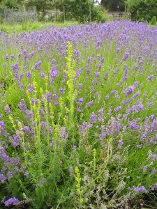 The lavender hedge not only gave me plenty of lavenders, it also softened the curved and hard edge of the stone path that extended the whole length of the border. An unforeseen bonus was with the reflected heat from the stone – it seemed to heighten their scent, filling the air along with myriads of bees and butterflies that were attracted to it. Another good bee plant was Purple Loosetrife, Lythrum salicifolium, a native plant normally found in damp places and by pond edges. This is a garden cultivar ‘Robert’, which is shorter than the type and was quite at home in ordinary garden soil. The ground cover rose ‘Magic Carpet’ was a close match in colour, the result quite strident but tempered by the lighter centre of the rose flower. I wouldn’t describe this as me at my most subtle!