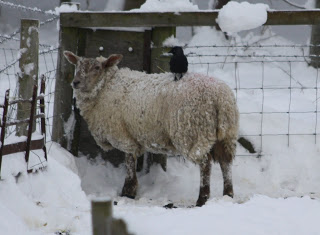 The sheep almost disappeared in the blizzard yesterday. Today the weather is calmer and this crow is taking advantage of searching for food in one of the ewe’s fleeces.