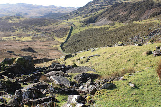 The weather started out unseasonably mild with beautiful blue skies from dawn to dusk giving clear views of the tops of the mountains. Of course, compared to the mountain ranges of the world, the mountains of Snowdonia are not high, Mt. Snowden being the highest at 3560ft. The photo below shows the Cadair Idris range at 2831ft, one of the most popular areas for hill walking. Often mistaken for an extinct volcano because of its crater like top, it was actually formed by glaciation during the last Ice Age.