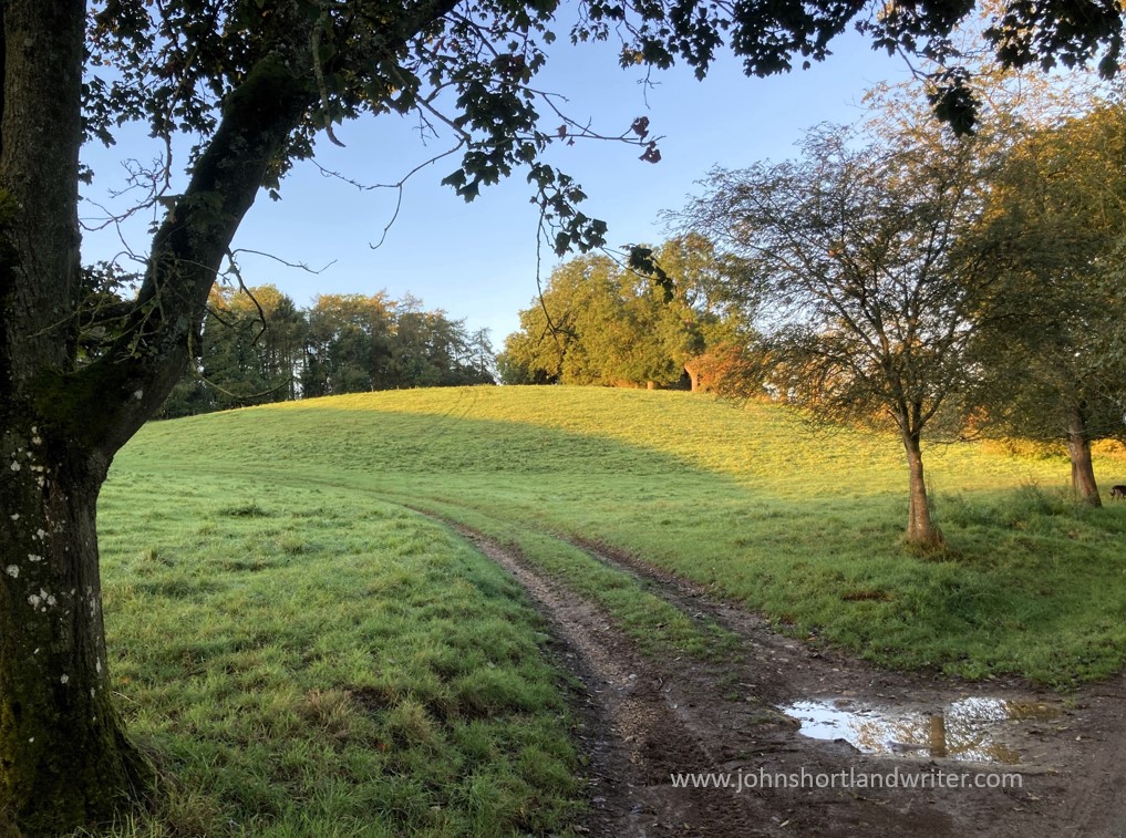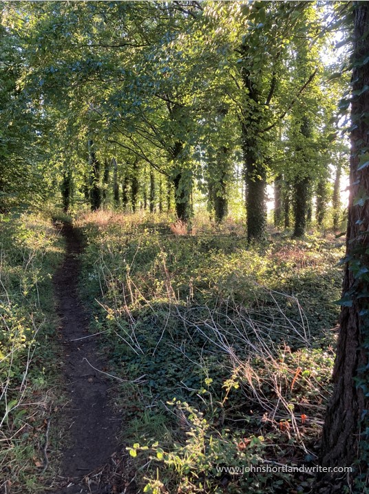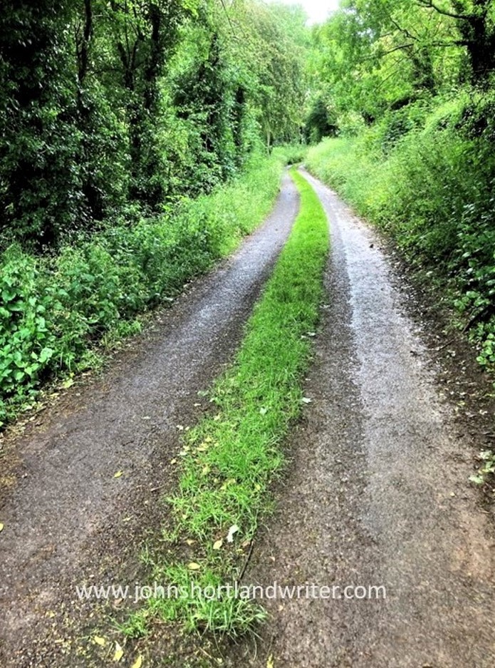 Although the path, now a wider track, looks obstructed here, the farmer/landowner has to leave the gate unlocked so that people on foot or on horseback can pass. Crossing the lane it returns to being a path, this time skirting a large wood. Now hidden by high hedgerows in the spring when the leaves are all bare, the woodland floor is carpeted with bluebells. In the centre of the field is a stand of mature oaks. Why were they left there? For me, they always have a mystical look about them; stepping into their midst the atmosphere changes as if its centuries old story is being told to those that might listen. Perhaps it’s just my imagination but the fancy is palpable.