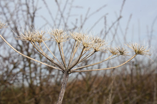 The wild flowers also show both signs of the winter and also spring life. Cow Parsley or ‘Keck’, as it is known locally around here, is sending up its young leaves which clearly show the reason for the ‘parsley’ in its name. Where ‘Keck’ originates from, I have no idea, for I have not come across that name when I lived in the Chiltern Hills just 50 miles away. Local plant names can be very confusing and make an interesting study in itself. Despite its lushness, Cow Parsley is poisonous. Later, in the summer, it will send up tall spikes of flat, white flowerheads made up of dozens of tiny stars. These dessicate to remain standing through the winter and, surprisingly, there are still a few that have survived the snow. They have a special beauty when the sun catches their metallic, bronzed skeletons.