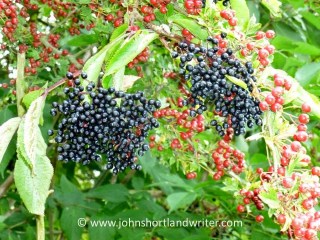 Within weeks the flowers which were held upright will have faded and drooped as berries form.  Even when green, streaks of colour hint of their ripeness to come.  By late summer, the clusters have turned almost black and make a welcome addition to fruit pies or, used on their own, in jam and wine making.